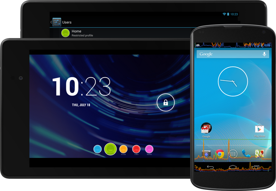 Android 4.3 extends the multiuser feature for tablets with restricted profiles, a new way to manage users and their capabilities on a single device. With restricted profiles, tablet owners can quickly set up separate environments for each user, with the ability to manage finer-grained restrictions in the apps that are available in those environments. Restricted profiles are ideal for friends and family, guest users, kiosks, point-of-sale devices, and more.
