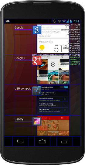 Building on the accessibility framework in Android 4.3, a new UI automation framework lets tests interact with the device’s UI by simulating user actions and introspecting the screen content. Through the UI automation framework you can perform basic operations, set rotation of the screen, generate input events, take screenshots, and much more. It’s a powerful way to automate testing in realistic user scenarios, including actions or sequences that span multiple apps.