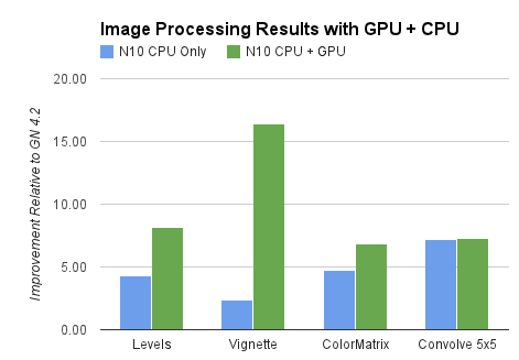 Android 4.1 extends Renderscript computation to give you more flexibility. You can now sample textures in your Renderscript compute scripts, and new pragmas are available to define the floating point precision required by your scripts. This lets you enable NEON instructions such as fast vector math operations on the CPU path, that wouldn’t otherwise be possible with the full IEEE 754-2008 standard.