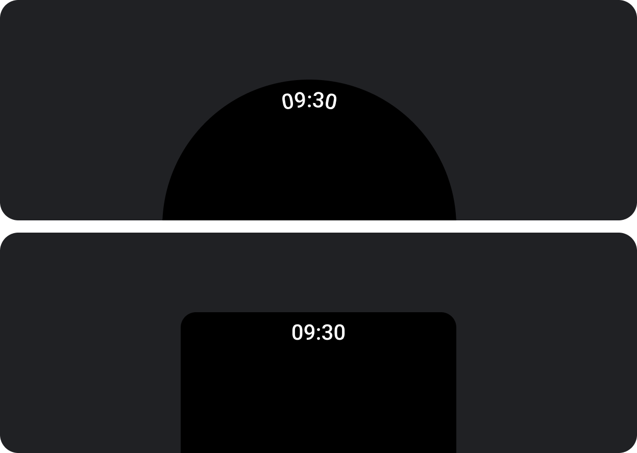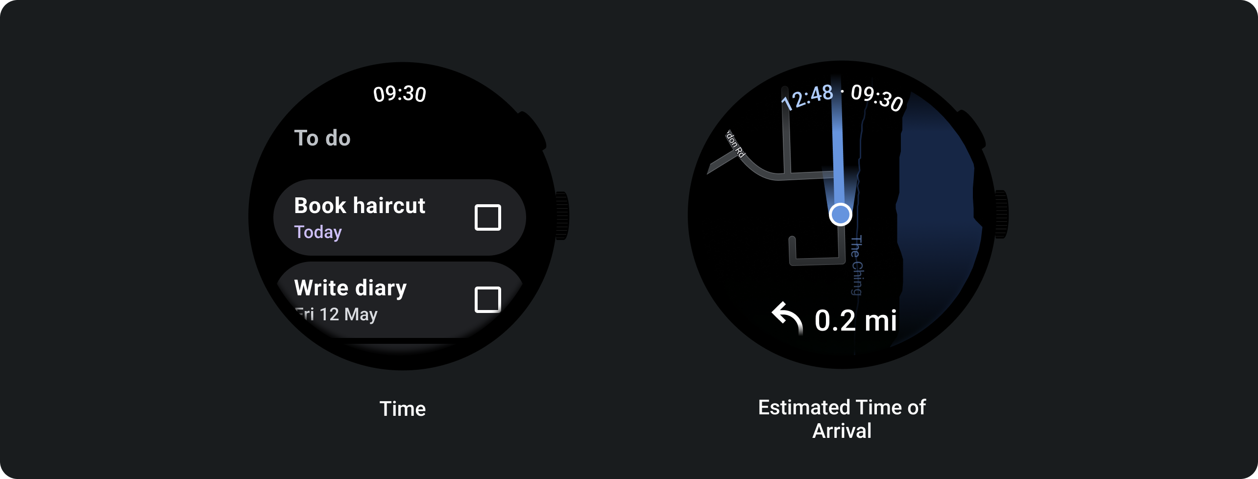 Use time text to display the time as well as an optional label on the top of the screen. When the device has a round screen time text is curved. When the device has a rectangular screen, time text is straight.