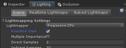 - Progressive CPU: Saves a lot of time because it incrementally creates light maps. If Prioritize View is selected, areas in the Scene view are prioritized. This can decrease the iteration time to set up your Scene’s light.