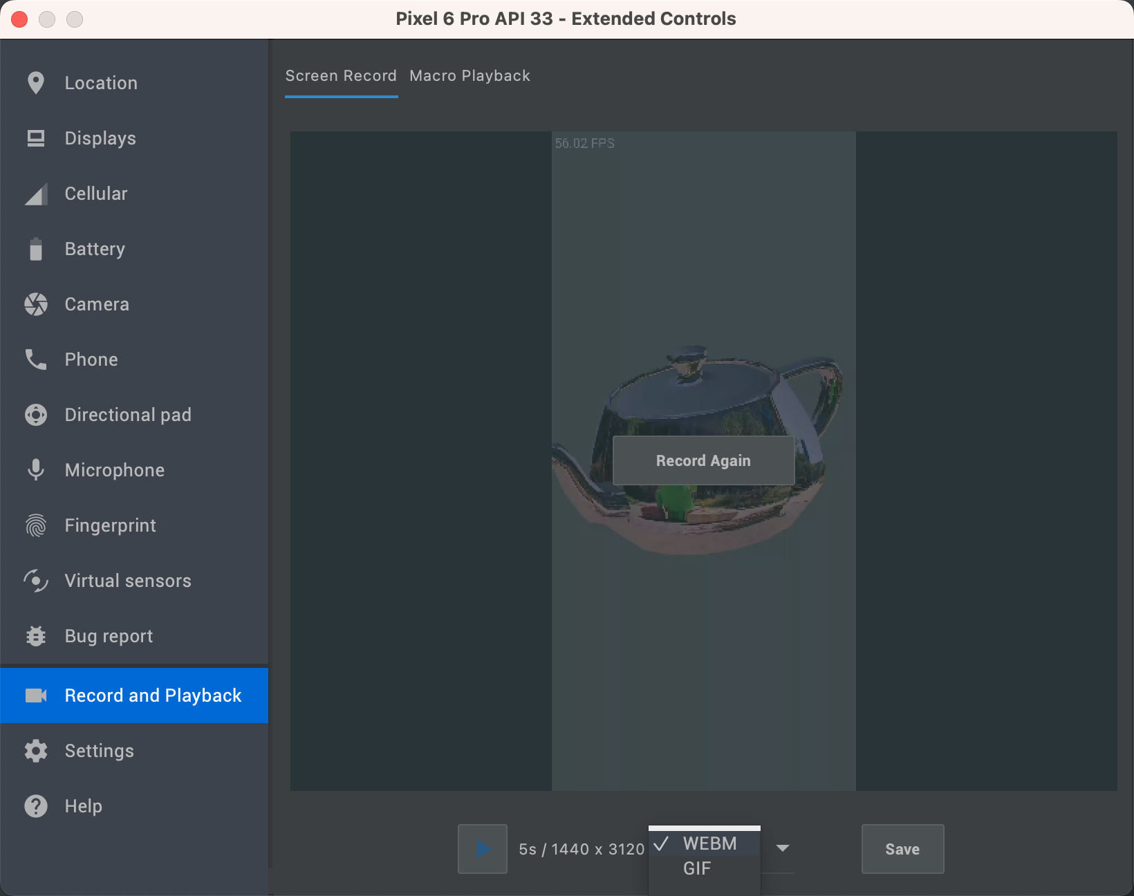 If you are using an emulator, you can record video directly from the Record and Playback tab in Extended Controls. Once you have recorded a video, you can save it as either WEBM or GIF format: