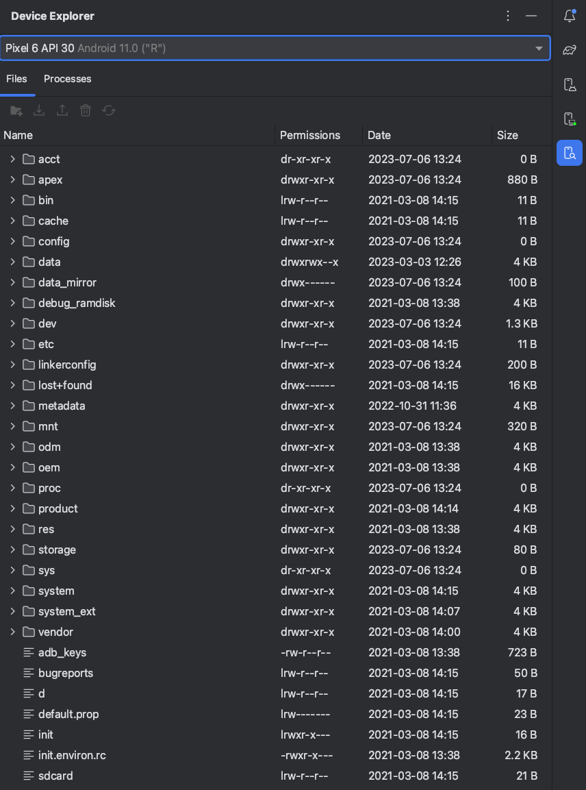 The Device Explorer lets you view, copy, and delete files on an Android device. It's useful when examining files your app creates or if you want to transfer files to and from a device.