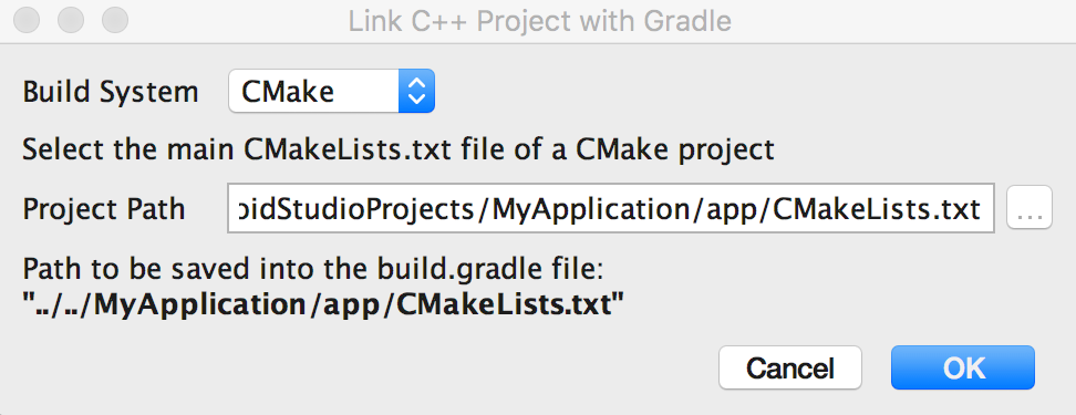 2. If you select ndk-build, use the field next to Project Path to specify the Android.mk script file for your external ndk-build project. Android Studio also includes the Application.mk file if it is located in the same directory as your Android.mk file.