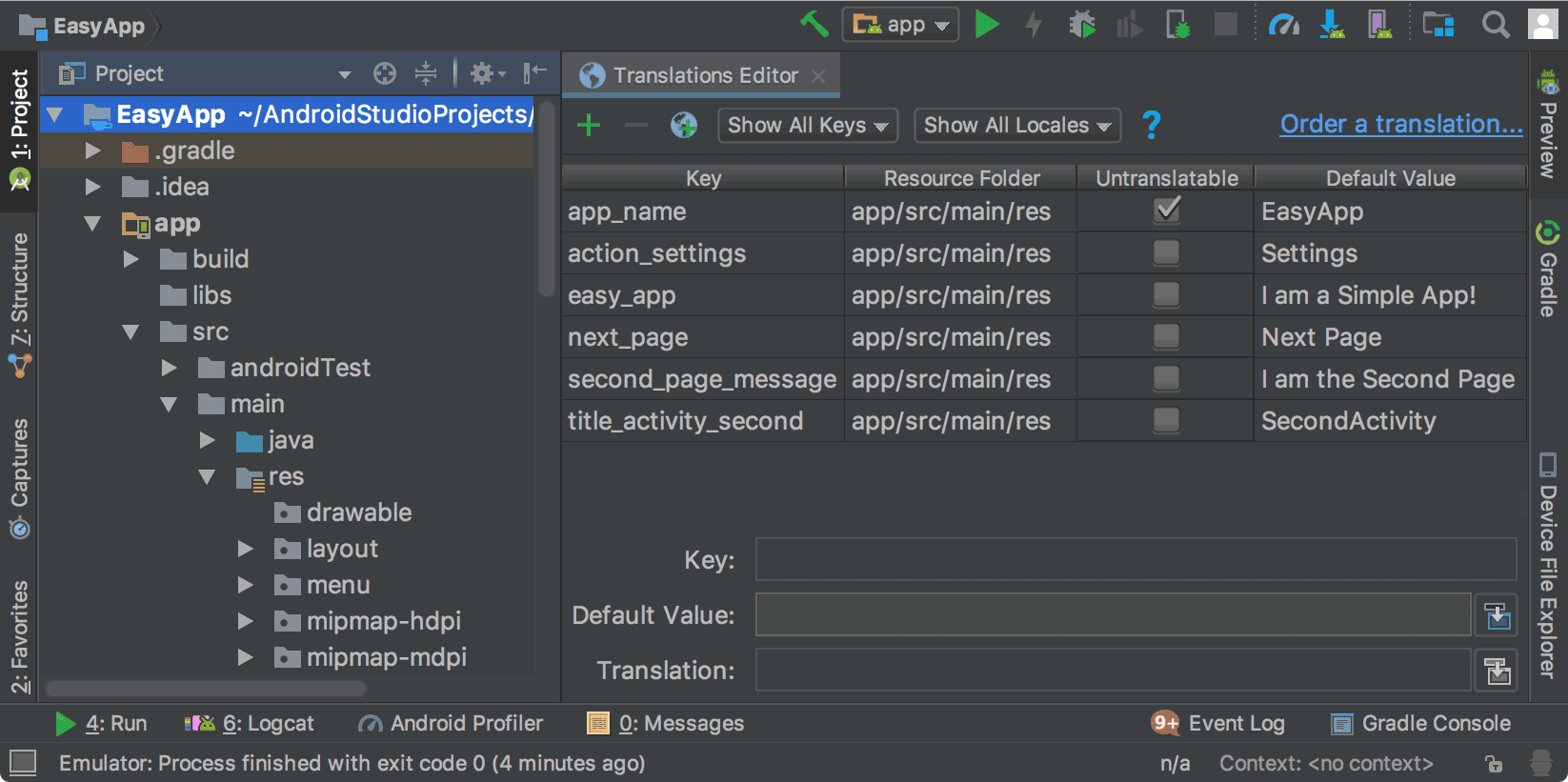 The Translations Editor displays the key and value pairs from the